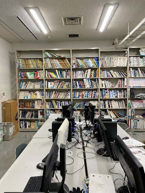 YE307は学部四回生が使う研究デスクが設置されています。学部四回生がデータ解析やシミュレーション、発表資料の作成に日夜励んでいます。学会論文や参考書をまとめた棚も設置されており、電気回路研究室の図書館としても機能しています。