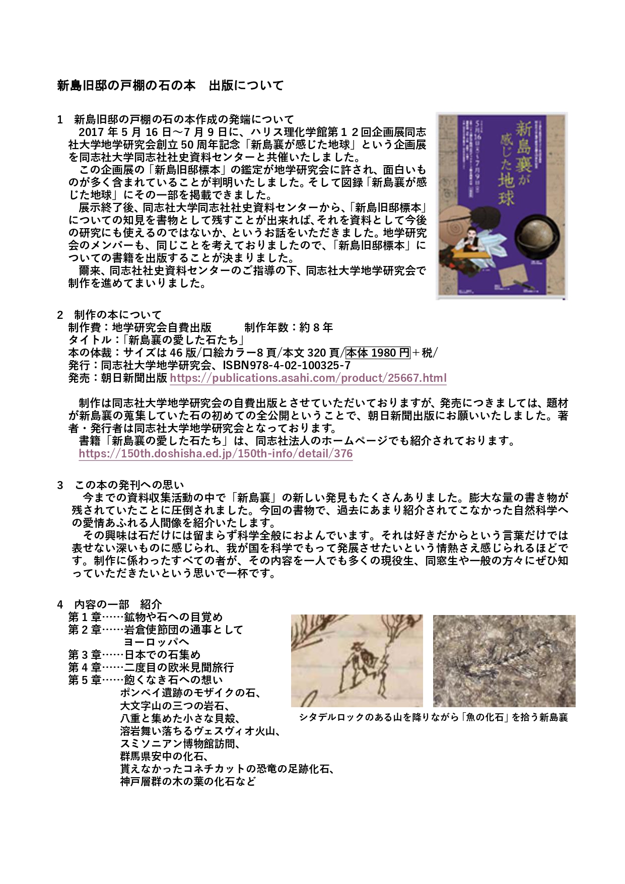 2017年に初めて地学研究会が調査した「新島旧邸の戸棚の石」の調査結果を中心に、自然科学者としての足跡を再発掘し、今まで多く紹介されている宗教家、教育者としての新島襄とは異なった人物像を描き出しております。